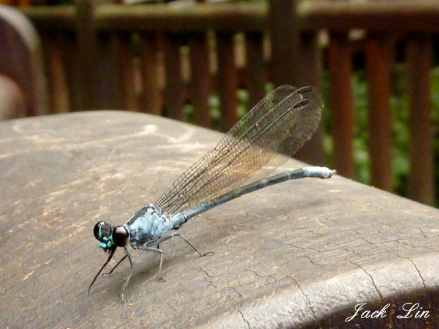 而有著藍綠色金屬光澤的美麗豆娘叫"白痣珈蟌",圖片上的是雄蟲,