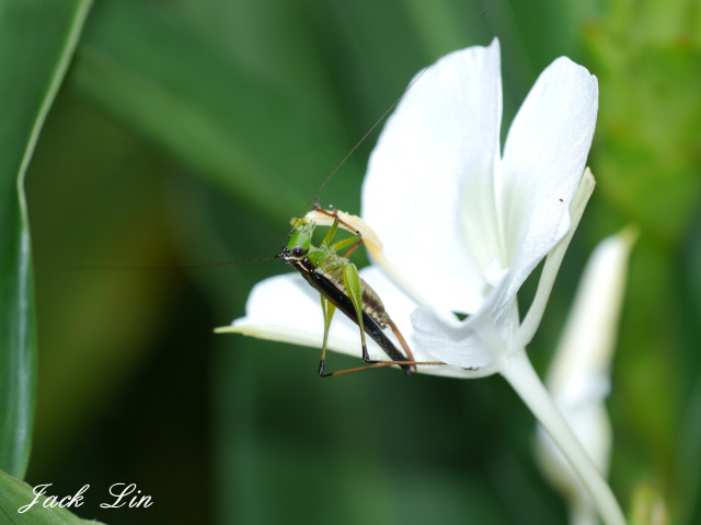 野薑花上剛好停了一隻螽蟴-黑翅細螽,這隻是雌蟲,腹部尾端有產卵管,