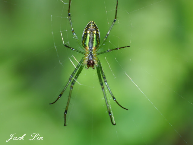 顏色斑斕的大銀腹蛛(雌蛛)腹部有兩條綠色縱紋像是兩個驚嘆號。