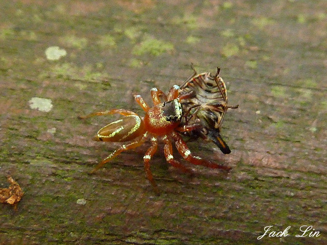在觀瀑步道上扶手,正巧看見一隻蠅虎-"細齒方胸蛛",
