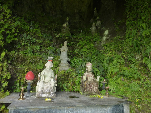 再遇小岔路,可至一處大岩洞,洞中滴水聚成石筍,形成天然石觀音像,故名:"觀音顯聖岩".