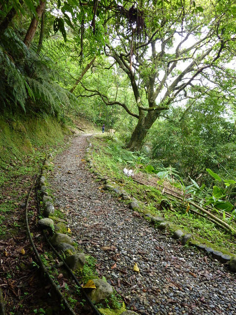 走出石階路,連上平坦的碎石子路,這就是東勢格越嶺古道,細看碎石子路兩旁還有枕木塊,