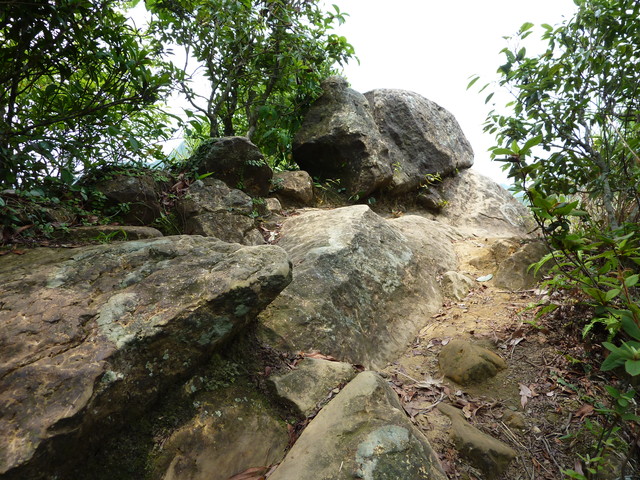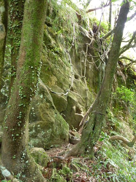 繞著山盤旋而上,一路都是岩石,不知道是那位山友在這裡綁了童軍繩,雖然感謝他的好心,