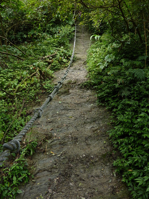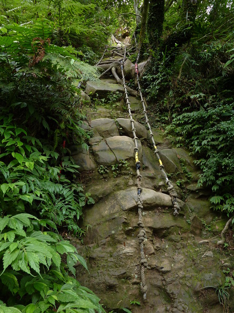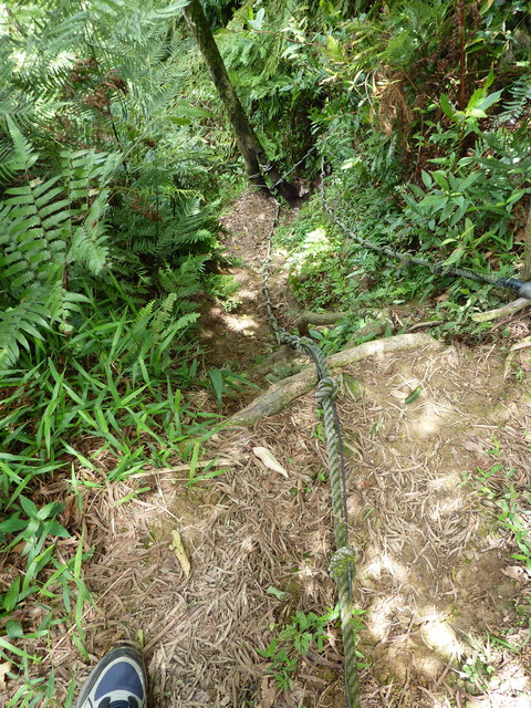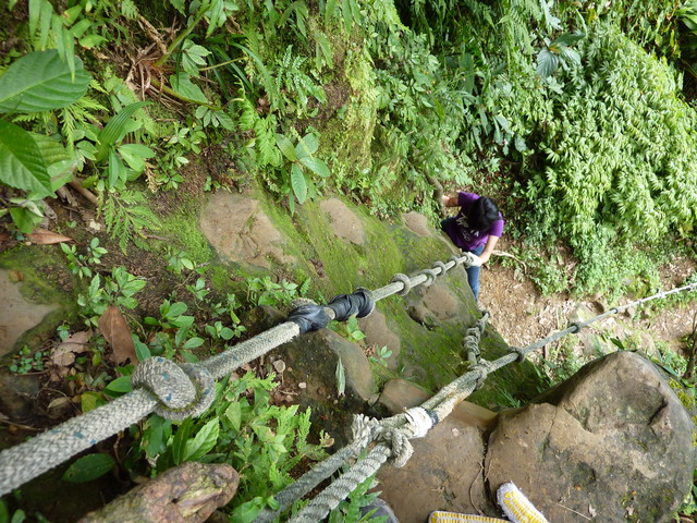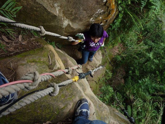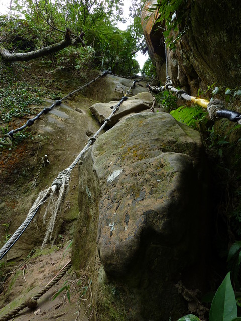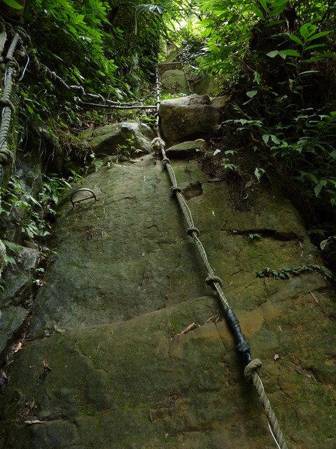 回程我們由1號崖壁下方經過,走南港山攀岩步道下山,又是一段不好走的攀繩道路,