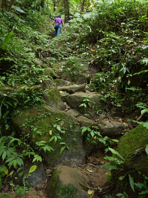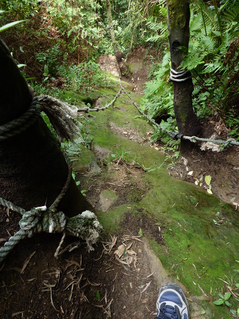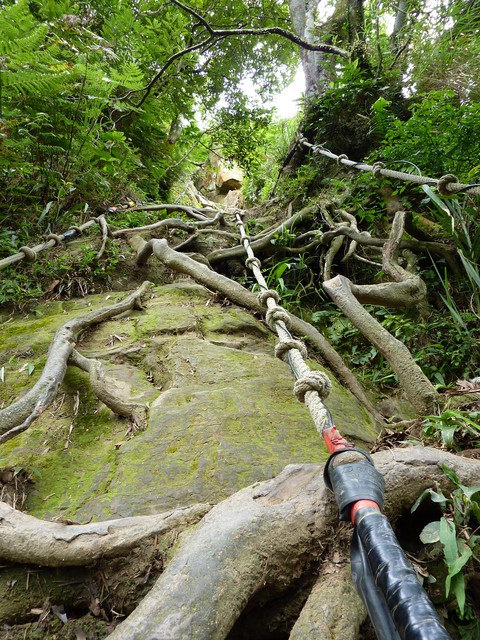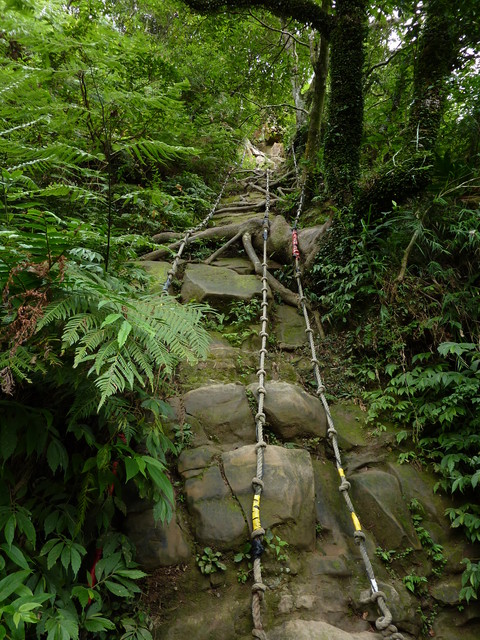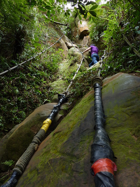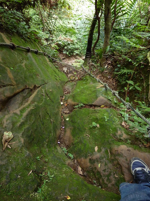 岩壁上長滿青苔,又剛下過雨,又濕又滑,要非常小心...