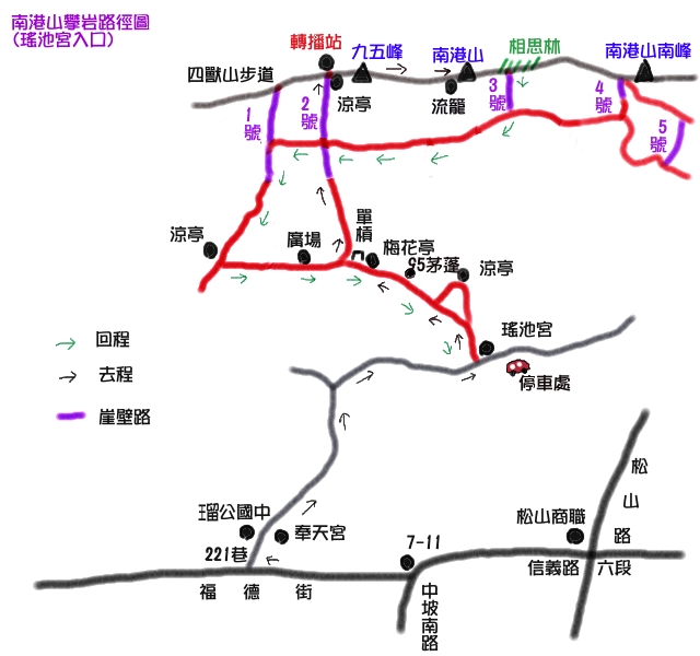 -->(15分鐘)九五坪-->單槓旁原始小徑入口-->(30分鐘)弧形崖壁.石壁-->(15分鐘)南港山攀岩步道