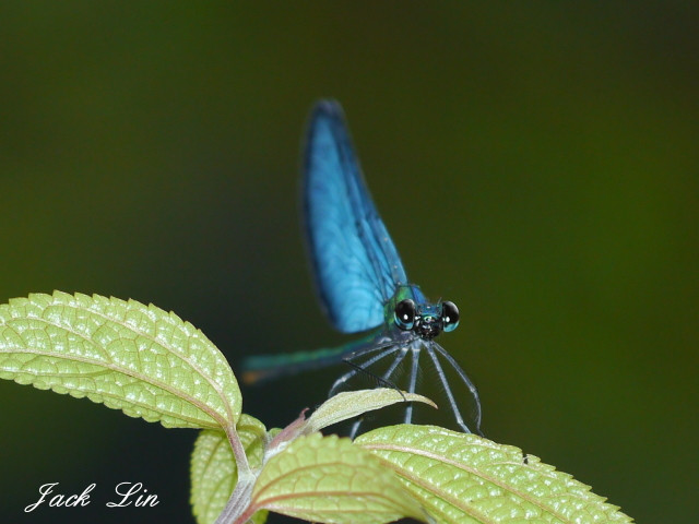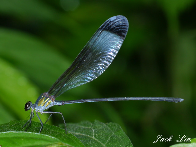 而有著藍綠色金屬光澤的美麗豆娘叫"白痣珈蟌",圖片上的是雄蟲,