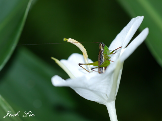 野薑花上剛好停了一隻螽蟴-黑翅細螽,這隻是雌蟲,腹部尾端有產卵管,