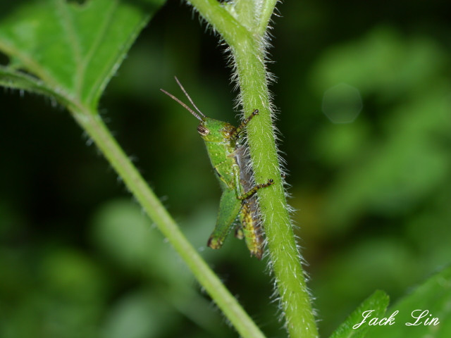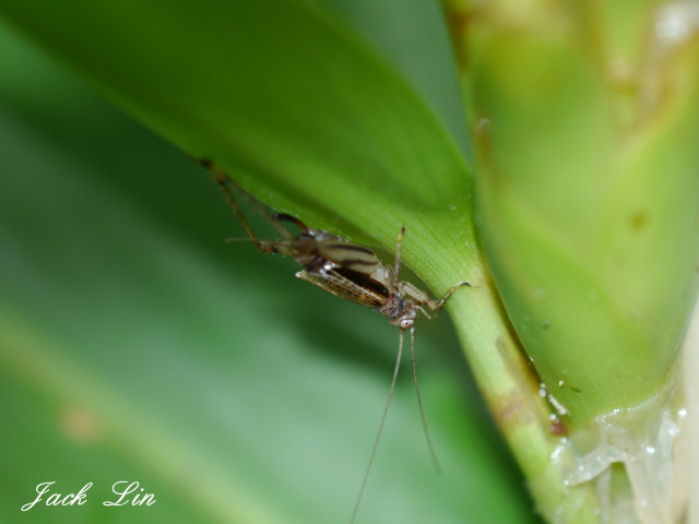 同樣在野薑花葉片下的還隱藏著一隻不知道是蟋蟀還是螽蟴的若蟲。