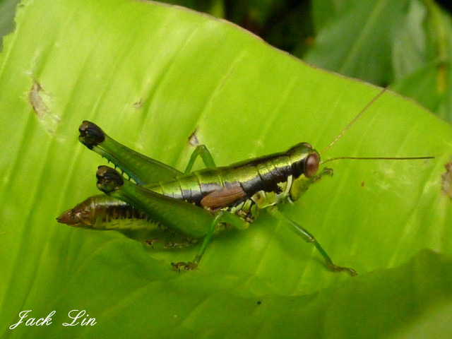路邊的芭蕉上停著一隻瘤喉蝗,原來蚱蜢也是挺漂亮的。