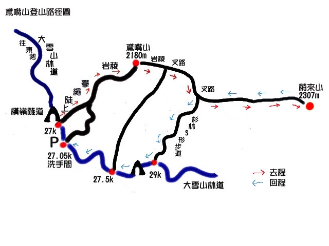 登完鳶嘴山,許多人從29K處直接下大雪山林道,但是我們這次繼續